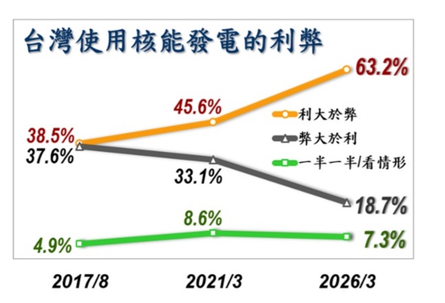 而民調數據又指出,認為在台灣使用核能發電利大於弊的有63.2%,認為弊大於利的有18.7%,認為利弊各半或看情形而定的有7.3%,未明確回答有10.9%。從民調數字可見民眾認同使用核電應該會是未來趨勢。