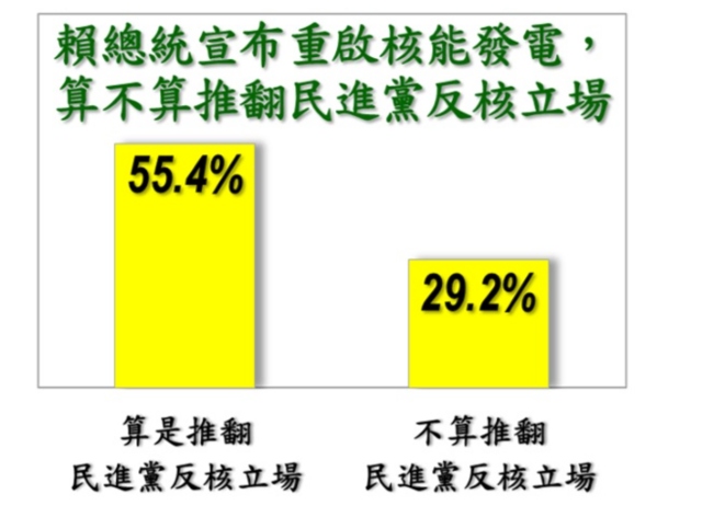根據《美麗島電子報》3月份民調詢問,賴清德宣布重新啟用核二、核三來發電,認為這算不算推翻民進黨過去的反核立場,結果有55.4%認為賴重啟核電是推翻民進黨反核立場,有29.2%認為賴“總統”重啟核電不算推翻民進黨反核立場,未明確回答有15.5%。
