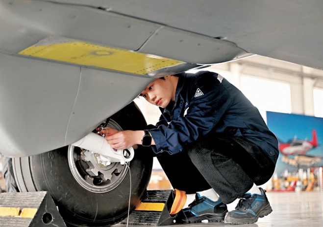 3月30日,在河南鄭州上街機場,工作人員在試飛前檢查運投無人機“長鷹-8”輪胎。(新華社)