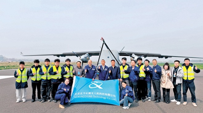 北京北方長鷹無人機科技有限公司的工作人員在“長鷹-8”前合影留念。(香港文匯報)
