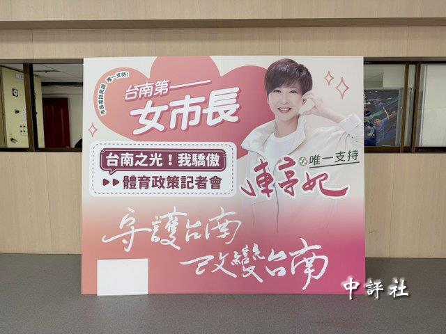 爭取民進黨台南市長初選提名的綠委陳亭妃3日舉辦公布體育政策記者會,會場有一面形象看板。(中評社 蔣繼平攝)