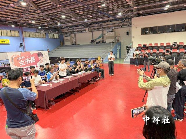 爭取民進黨台南市長初選提名的綠委陳亭妃3日舉辦公布體育政策記者會,教練與選手到場支持。(中評社 蔣繼平攝)