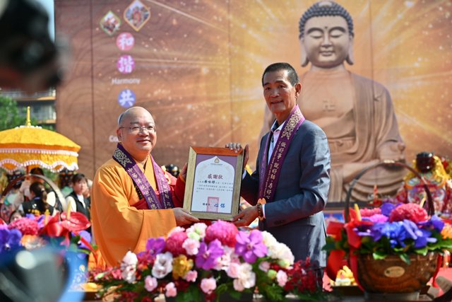 佛光山住持心保和尚(左)頒予感謝狀予北港朝天宮董事長蔡咏鍀(右)感謝號召108千順將軍神尊。(照:佛光山提供)