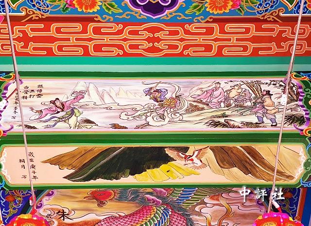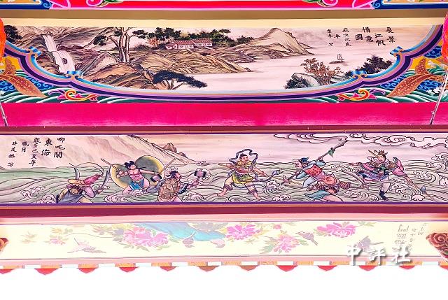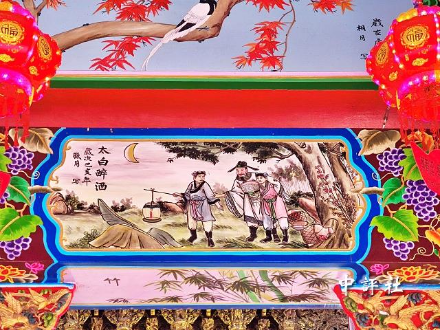 抬頭一看,能看見詩仙李白醉酒的灑脫姿態、哪吒鬧東海的生動神話、孫悟空三打白骨精的精彩橋段,還有象徵祥瑞的四大聖獸、如詩如畫的江南山水、莊嚴肅穆的孔孟聖賢以及三國人物等。彩繪豐富了廟宇的視覺層次,也牽起另類的兩岸連結。