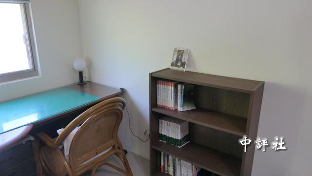 賴清德的小書桌,書櫃被整理過放著成功立志相關書籍,櫃上相片是賴拿著自己出的書。(中評社 張穎齊攝)