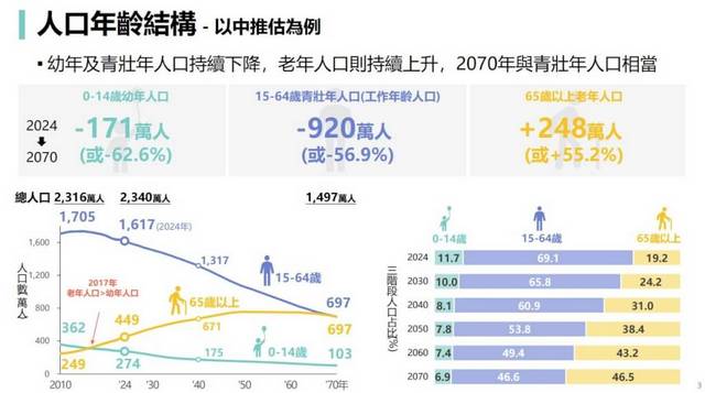 “國發會”指出,2024年,全球約有1/4個國家或地區進入人口負成長,包含台灣、日本、韓國、中國大陸及泰國等亞鄰國家。預估未來台灣總人口將從2024年的2340萬人,減少至2070年的1497萬人,減少844萬人;其中,0至14歲幼年人口減少171萬人,15至64歲青壯年人口減少920萬人,65歲以上老年人口則增加248萬人。
