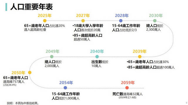 根據最新推估,假設未來每位婦女一生僅生育1名子女的中推估下,未來短期人口重要時點將維持前一版推估,進入“超高齡社會”時點維持2025年不變,“人口紅利”結束時點維持2028年不變。