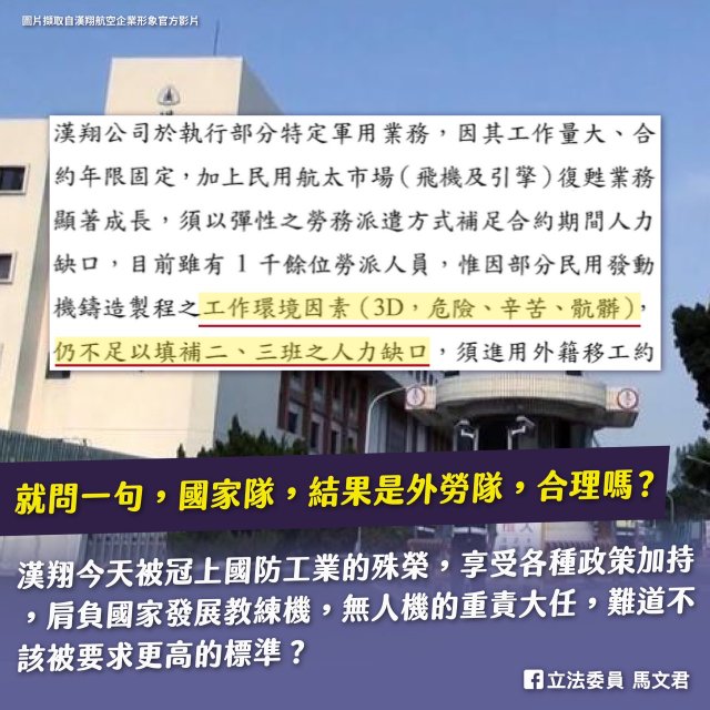 馬文君認為,確實如今台灣各種產業,都飽受缺工之苦。但是漢翔被冠上“國防”工業的殊榮,享受各種政策加持。別的產業在市場上競爭,希望引進外勞,兼顧生產效能與成本,“國防”工業,肩負“國家”發展教練機,無人機的重責大任,難道不該被要求更高的標準?就問一句,“國家隊”,結果是外勞隊,合理嗎?