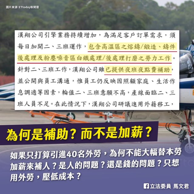 馬文君批評,漢翔歸咎本勞不願意做辛苦工作,但同一篇回覆也寫道,已提供夜班夜點費“補助”,為何是補助?而不是加薪?如果只打算引進40名外勞,為何不能大幅替本勞加薪來補人?是人的問題?還是錢的問題?只想用外勞,壓低成本。