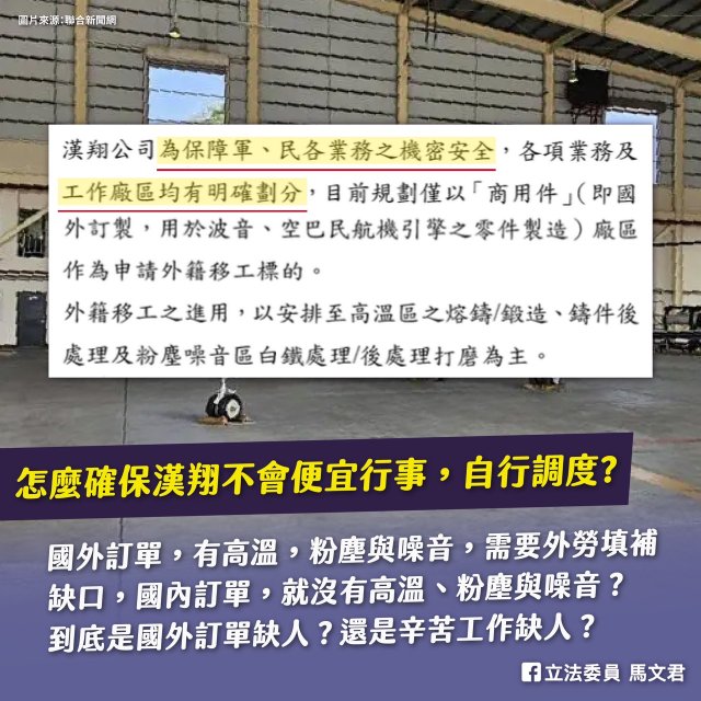馬文君質疑,海外訂單,有辛苦工作,台灣訂單,就沒有?海外訂單,有高溫,粉塵與噪音,需要外勞填補缺口。台灣訂單,就沒有高溫、粉塵與噪音?到底是海外訂單缺人?還是辛苦工作缺人?如果是後者,怎麼確保漢翔不會便宜行事,自行調度,全信漢翔一句話?“如今的回覆,無法說服我,也應受社會公評”。