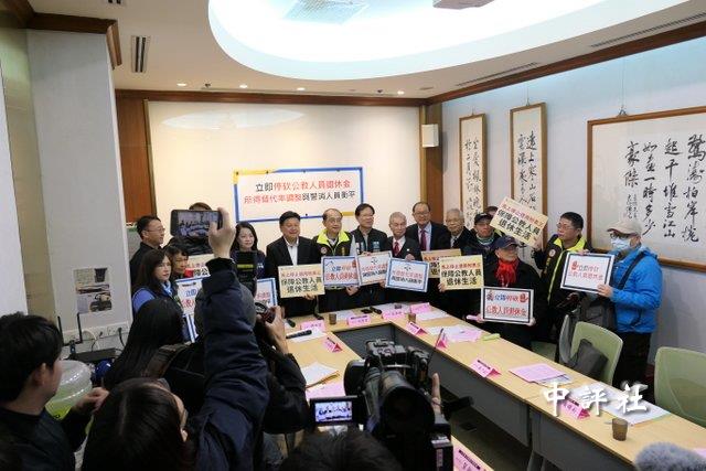 中評社台北1月10日電(記者 俞敦平)“立法院”日前通過《警消人員人事條例》三讀,提高退休警消所得替代率。公務人員協會與多個相關團體今日在“立法院”共同召開記者會,呼籲立即停砍公教人員退休金遞減,並調整所得替代率與警消人員平等。多位藍白“立委”現身力挺,強調此議題攸關社會公平與國家治理的根基。