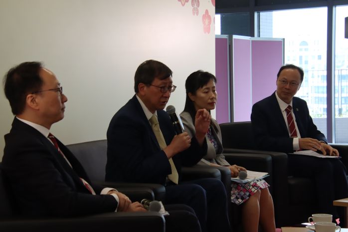 教大校長李子建教授(左二)、副校長(學術)鄭美紅教授(左三)、副校長(研究與發展)陳智軒教授(左一)、及副校長(行政)方永豪博士(右)積極回應記者提問。(中評社 焦陽攝)