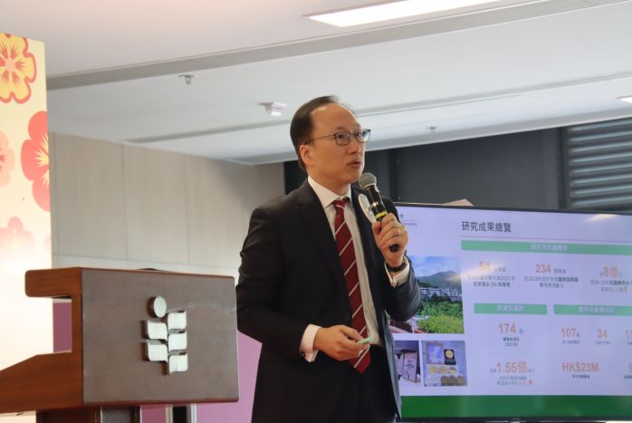 副校長(研究與發展)陳智軒教授介紹教大在科研創新、知識轉移及區域發展方面的積極角色。(中評社 焦陽攝)