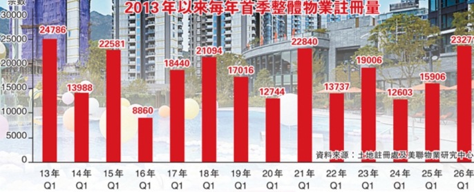 美聯集團主席黃建業則強調,現時數據未反映中東局勢的影響,須審慎注意油價及息口走勢,由於樓市首季交投升幅太過顯著,第二季或現按季“價升量微跌”。惟他相信,港樓表現強韌,如戰爭平息,下半年樓市將轉彎入直路,第三季起有機會恢復增速,維持全年“價量齊升”預測,全年樓價料升約10%。