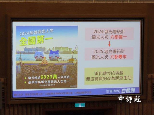 白喬茵表示,觀光發展上,市府主打的觀光成效並未實質帶動周邊產業。根據“財政部”統計,2025年高雄餐飲業銷售額排六都第五,旅宿業營業額甚至下滑 1.2%;“觀光署”資料更顯示,高雄去年整體觀光人數名列六都最末。