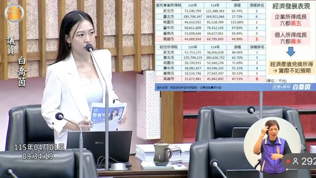 國民黨籍高雄市議員白喬茵1日在議會質詢指出高雄經濟發展六都墊底。(圖:高雄市議會直播)