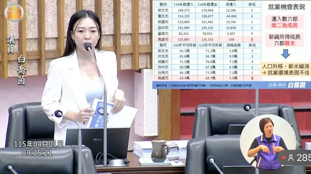 國民黨籍高雄市議員白喬茵1日在議會質詢指出高雄就業機會表現六都墊底。(圖:高雄市議會直播)