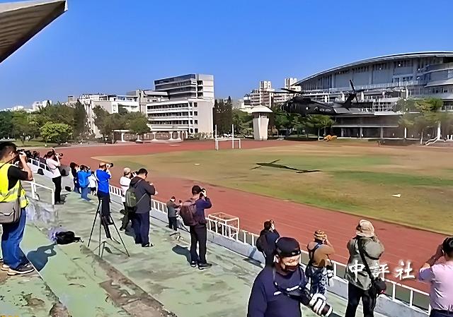 陸軍航空601旅2日先行展開起降操演,2架直升機緩緩飛近台中逢甲大學的校園操場,之後由UH-60M黑鷹直升機領航,先進行降落任務。再由AH-64E阿帕契攻擊直升機,低空盤旋降落,現場颳起陣陣塵土,氣勢磅礡。