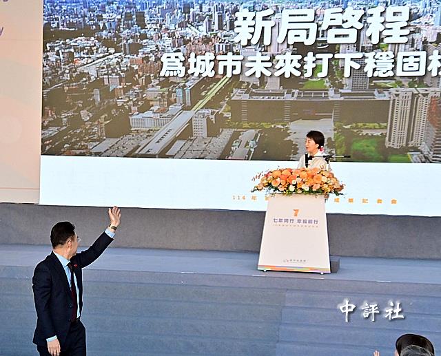 盧秀燕施政周年記者會秀出“新局啟程”字樣,台下江啟臣正好被唱名起立接受民眾喝采。(中評社 資料照)