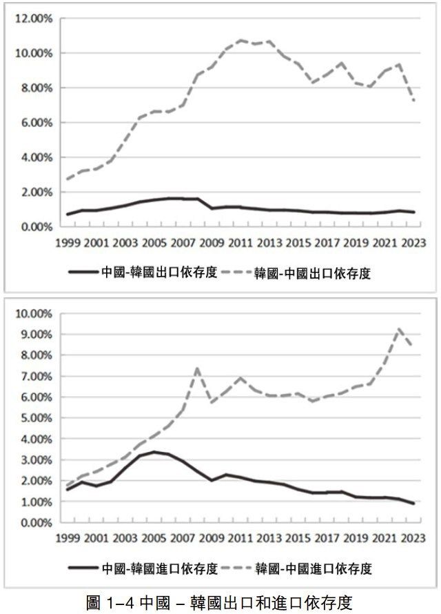 從中韓貿易依存度來看(圖1-3), 1999—2023年期間,中國與韓國貿易依存度也呈現“中國對韓國依存度下降,韓國對中國依存度上升”的變動格局。中國對韓國貿易依存度(“中國-韓國”)整體呈下行趨勢,而韓國對中國貿易依存度(“韓國-中國”)長期保持上升態勢,反映出兩國貿易依賴關係的轉變。1999—2005年,中國對韓國貿易依存度從約2.0%逐步升至4.0%以上,2005年後波動下降,2015年後穩定在2.0%以下。這一變化與中國產業升級、本土供應鏈完善及貿易多元化策略相關。韓國對中國的貿易依存度呈現顯著上升趨勢:1999年起步於4.0%左右,2005年後加速增長,雖期間存在短期波動但2021年整體攀升至近18.0%的高位。這表明韓國經濟對中國市場的需求持續加深,中國龐大的消費需求、產業鏈配套能力對韓國出口形成關鍵支撐作用。從進出口依存度對比看,2005年後韓國對中國的依存度持續顯著高於中國對韓國的依存度。