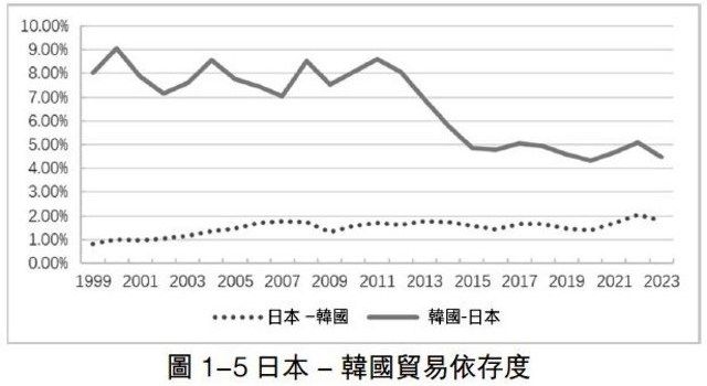 1999—2023年,日本與韓國貿易依存度呈現“韓國對日本依存度波動下降,日本對韓國依存度緩慢上升”的演變格局。韓國對日本貿易依存度整體呈波動下行趨勢,而日本對韓國貿易依存度雖增速平緩,但長期保持上升態勢,反映兩國貿易依賴關係的非對稱性調整。1999—2013年,韓國對日本貿易依存度在7.0%—9.0%區間波動,期間受產業合作、技術引進等因素影響,呈現階段性峰值(如2001年、2005年、2011年)。2013年後,依存度持續下降,2023年降至4.0%左右。從進出口依存度對比看,韓國對日本的依存度始終高於日本對韓國的依存度,但差距隨時間推移逐漸縮小。這一演變既反映韓國早期對日本技術、產業配套的依賴,也凸顯韓國產業競爭力的提升;同時,日本對韓國新興產業產品的需求增長,推動其對韓依存度緩慢上升。日本對韓國進口依存度長期處於低位(1.0%以下),1999—2023年呈緩慢上升態勢,反映韓國在日本進口供應鏈中的作用逐步提升。韓國對日本進口依存度呈現“波動下降”特徵,1999年約5.5%,2023年降至3.0%左右。