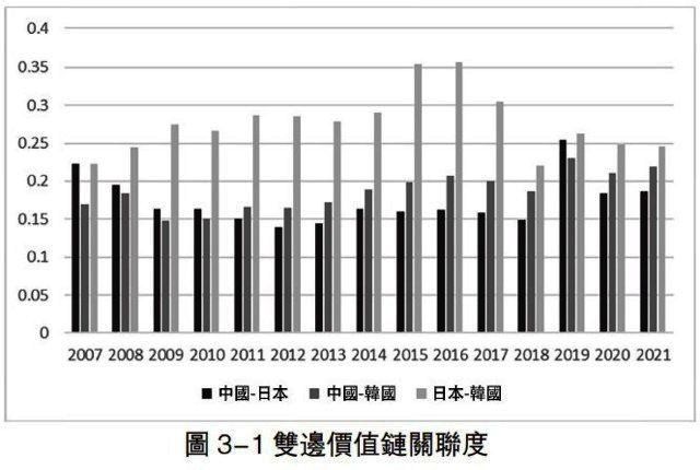 2007—2021年,中日韓三國雙邊價值鏈關聯度呈現差異化特徵,日本-韓國價值鏈關聯度整體最高。中國嵌入韓國產業價值鏈的程度逐步提升,雙邊產業互補性推動關聯度增長。中國-日本價值鏈關聯度相對穩定,雙方價值鏈協作的深度與穩定性弱於其他組合。總體來看,日韓技術密集型協同、中韓製造業互補,反映三國在產業鏈關聯上的動態調整。