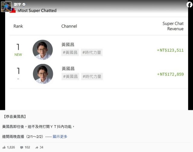 根據截圖可見,黃國昌分別在兩天獲得12萬3511元以及17萬2859元抖內,針對Playboard系統標註頻道關鍵字為“#時代力量”,四叉貓也補充說明,可能是系統依據該頻道過去曾大量使用的標籤進行分類,並非近期立場或政黨屬性變動。